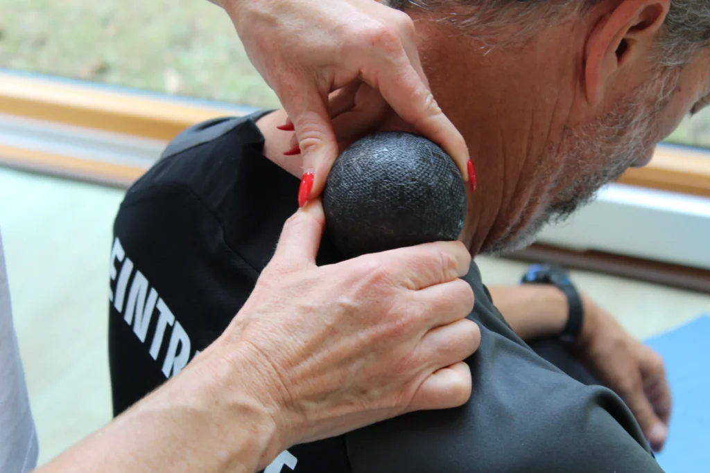 Die Faszien-Rollmassage unterstützt die Wirkung der Engpassdehnungen, indem sie auch tieferliegende Muskeln erreicht und die Durchblutung fördert.